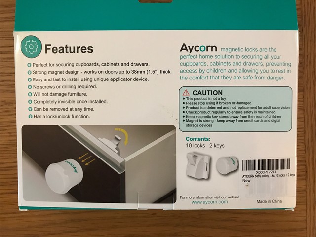 Aycorn magnetic safety locks drawers. These Aycorn Child Baby Safety Magnetic Cupboard Locks keep your child safe from dangerous items in drawers cupboards and cabinets. Our magnetic safety cupboard locks table corner protectors thermometers and baby monitors have been expertly crafted to provide you peace of mind and to help you protect your child. Strong mini magnetic keys means doors up to 38 mm 15 thick can safely be secured better than some other childproofing lock.